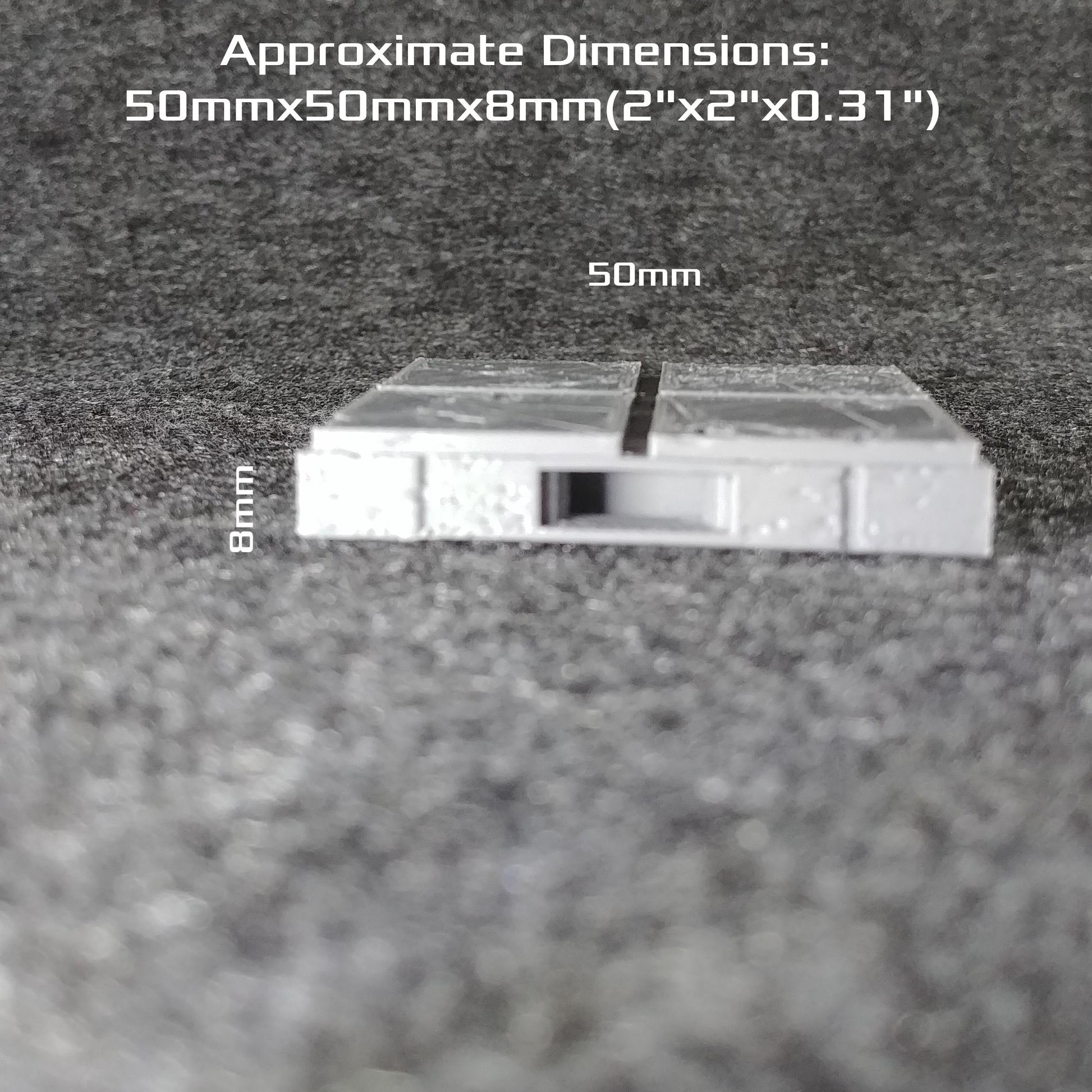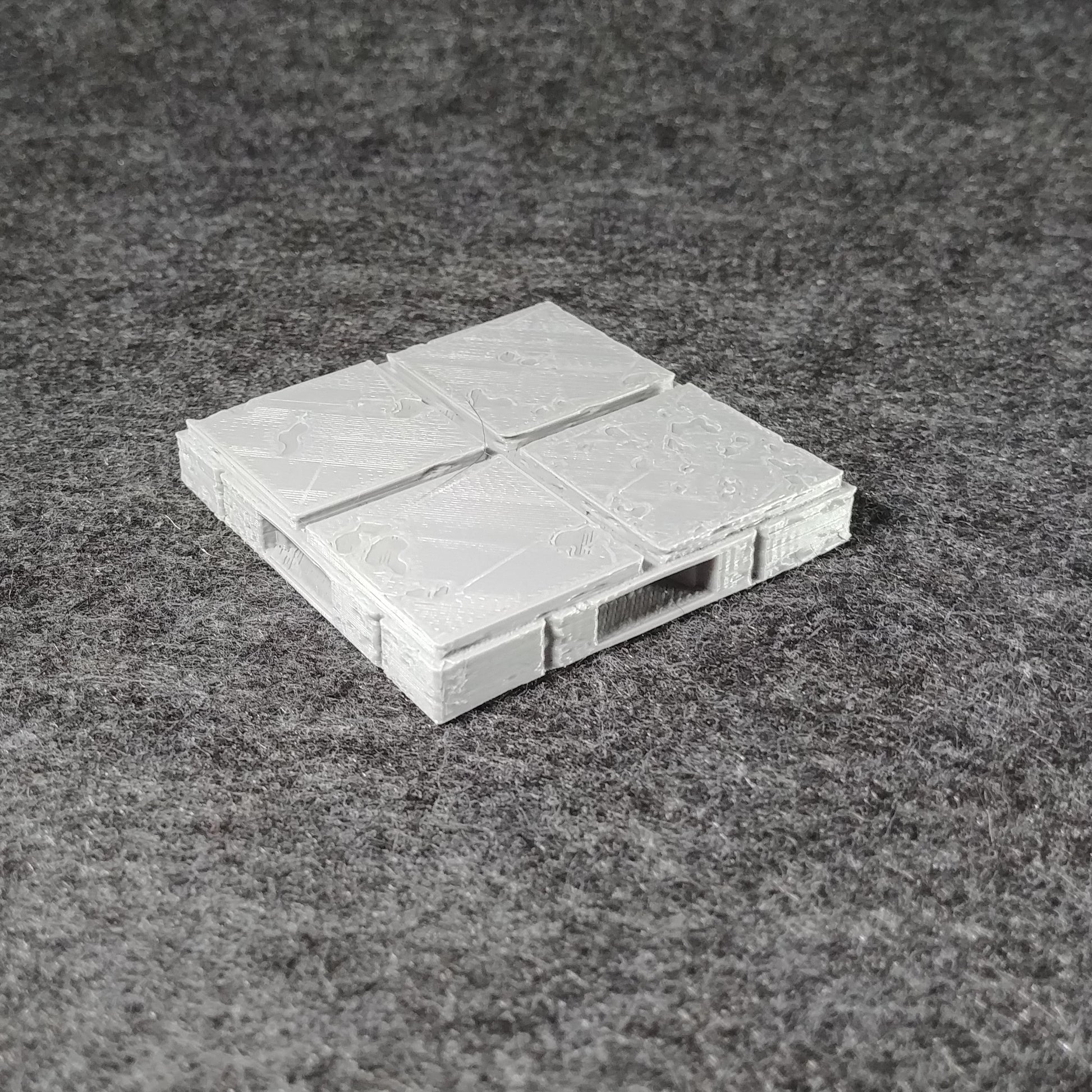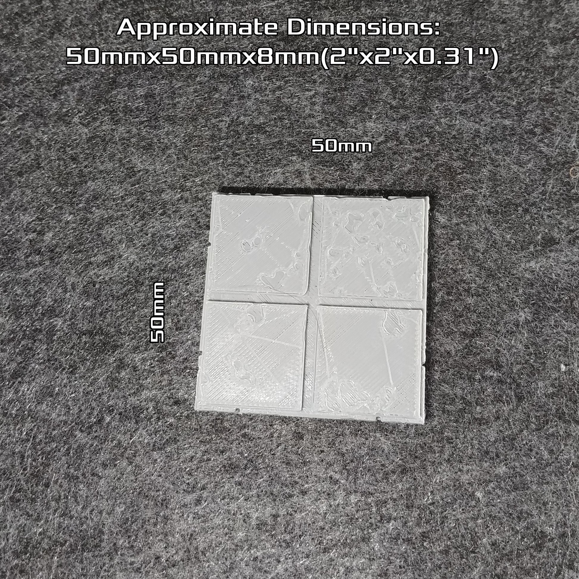 This tile is printed with on glass, giving a slight stickiness to the base on smooth surfaces to help sets stay in place. The top layer was originally designed with some shallow textures that can be used to mix up the shading. The printing process may leave lines between these small features, which can either be blended with shading, or the whole surface can be sanded or coated to remove the surface features entirely.